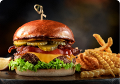 House BBQ sauce, Wisconsin cheddar, applewood bacon, crispy frizzled onions, shaved lettuce, tomatoes