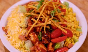 Romaine, BBQ chicken, corn, pinto beans, grape tomatoes, crisp tortilla strips, cheddar jack, BBQ ranch