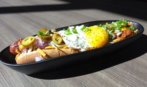 All beef foot long hot dog topped with chili, onions, cheddar, jalapeños and a fried egg